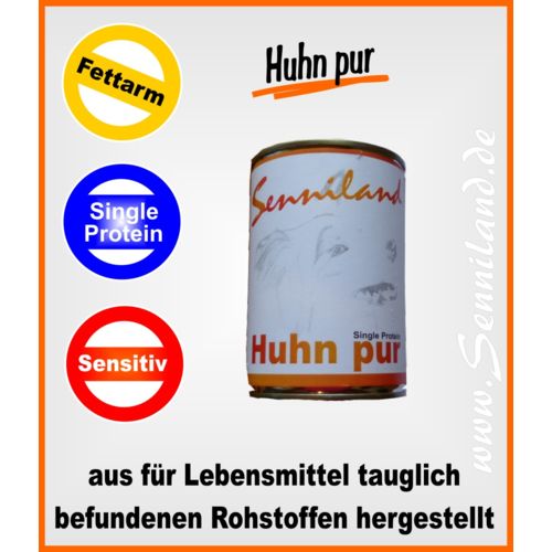 Unser hochwertiges Senniland-Naßfutter eignet sich perfekt zur Ernährung im Rahmen einer Ausschlußdiät oder einfach zur gesunden Ernährung. Besonders zeichnet dieses Naßfutter den sortenreinen Inhalt (Single Protein) ohne Nebenprodukte aus. Wenn Huhn drauf steht, ist auch Huhn drin - ausschließlich !